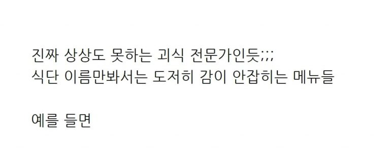 해당 글 작성자는 “진짜 상상도 못하는 괴식 전문가인듯;;;”이라며 “식단 이름만 봐서는 도저히 감이 안 잡히는 메뉴들”이라고 전했다.
