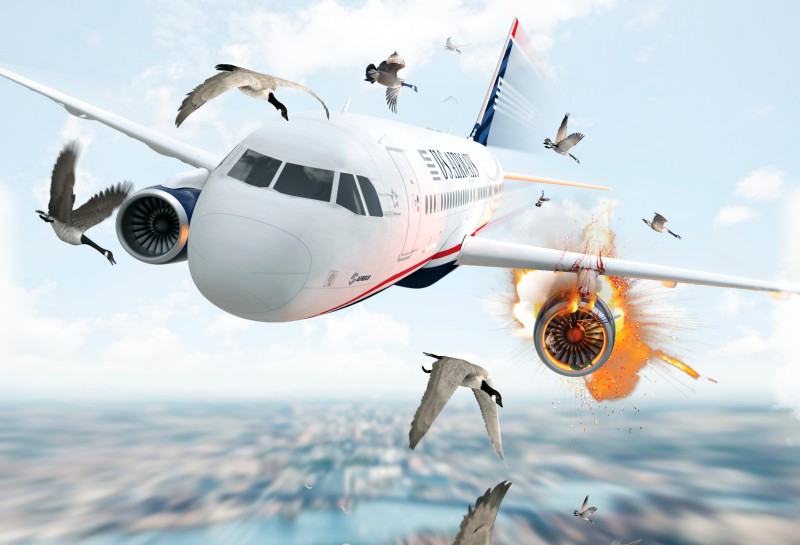 그런 경우는 새가 엔진 속으로 빨려 들어갈 때 생기면서 새가 엔진을 망가뜨려 화재와 추락을 일으킬 수 있다.