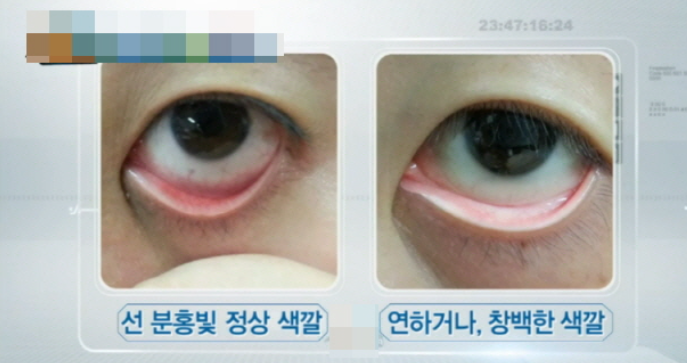 눈꺼풀 안쪽에 얼룩덜룩하면서 반점 같은 것들이 보이는 경우에는 주의가 필요하다.