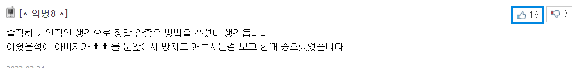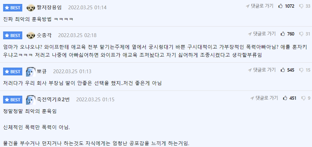 또 “신체적인 폭력만 폭력이 아니죠. 저거는 딸아이가 정말 충격받았을 것 같아요.”라는 반응도 보였다.