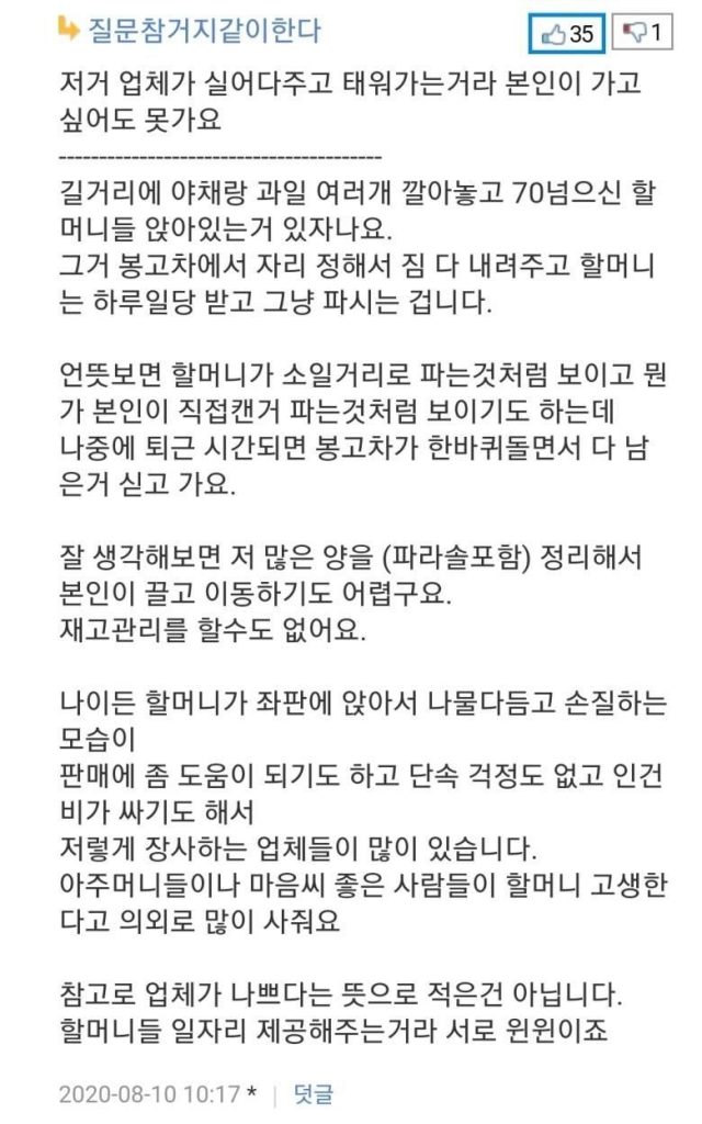 한 누리꾼은 “길거리에 야채랑 과일 여러개 깔아 놓고 70 넘으신 할머니들 앉아 있는 경우 있는데 그거 봉고차에서 자리 정해서 짐 다 내려주고 할머니는 하루 일당 받고 그냥 파시는 겁니다”라고 주장했다.