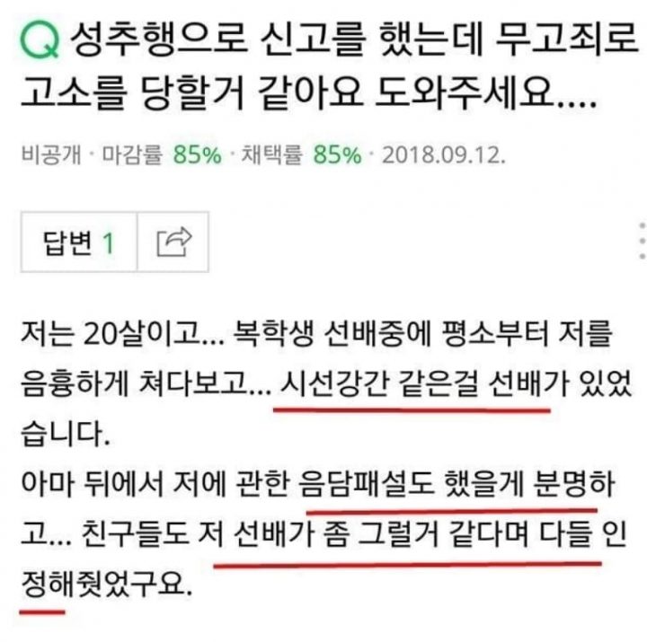 이어 “근데 며칠 전에 그 선배한테 연락이 와서는 자기는 그 시간에 집에 있었고, 아파트 들어가고 그 뒤 나오지 않는 모습 CCTV에 있다고 그게 증거라고 저보고 너 무고죄라는 걸 아냐고 저한테 협박을 했다”라고 말했으며 또 “저보고 거짓말 탐지기 경찰에서 해볼 수 있다고 협박하길래 무서워서 차단했다. 친구한테도 부탁해서 아까 서로 다 짜두었는데.. 만약 정말 무고죄로 절 신고하면 저는 경찰서에 가서 조사를 받아야 하나?”고 물었다.