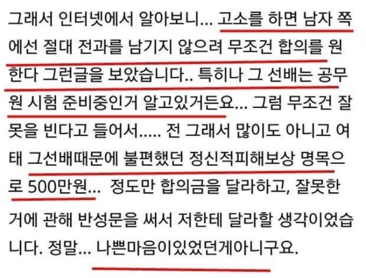 또 “전 많이도 아니고 여태 그 선배 때문에 불편했던 정신적 피해보상 명목으로 500만 원 정도만 합의금을 달라고 요구하고, 잘못한 것에 대해 반성문을 써서 저한테 달라고 할 생각이었다. 정말 나쁜 마음이 아니었다”고 토로했다.