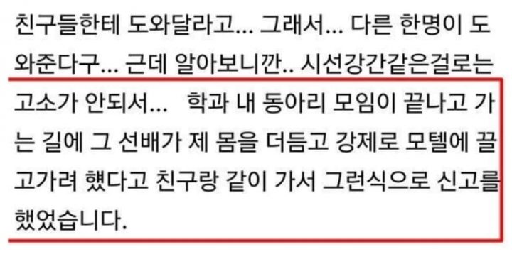 A씨는 “근데 알아보니까 시선 강간으로는 고소가 안 되는 것 같아서 학과 내 동아리 모임 끝나고 가는 길에 선배가 제 몸을 더듬고 강제로 모텔에 끌고 가려 했다고 친구들이랑 같이 가서 신고를 했었다”라고 설명했다.