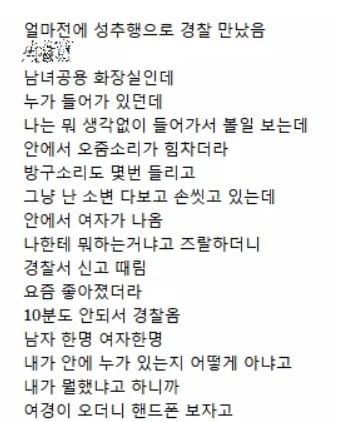 A씨는 “얼마 전에 성추행으로 경찰들을 만났다”며 “남녀 공용 화장실에 들어갔는데, 변기 칸에 누가 들어가 있었다”며 “소변을 누는 소리가 들렸고 방귀 소리도 들렸다”고 설명했다.