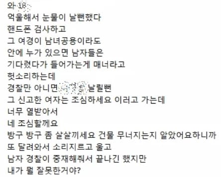 그는 “경찰에게 ‘내가 안에 누가 있는지 어떻게 아냐’ ‘내가 대체 뭘 했냐’고 따지니까 여경이 휴대폰을 보자고 하더라. 정말 억울해서 눈물이 나올 뻔했다”며 억울함을 토로했는데 “휴대폰 검사를 마친 여경이 ‘안에 누가 있으면 남자들은 기다렸다가 들어가는 게 매너’라고 하는데 경찰만 아니면 때릴 뻔했다”며 분노했다.