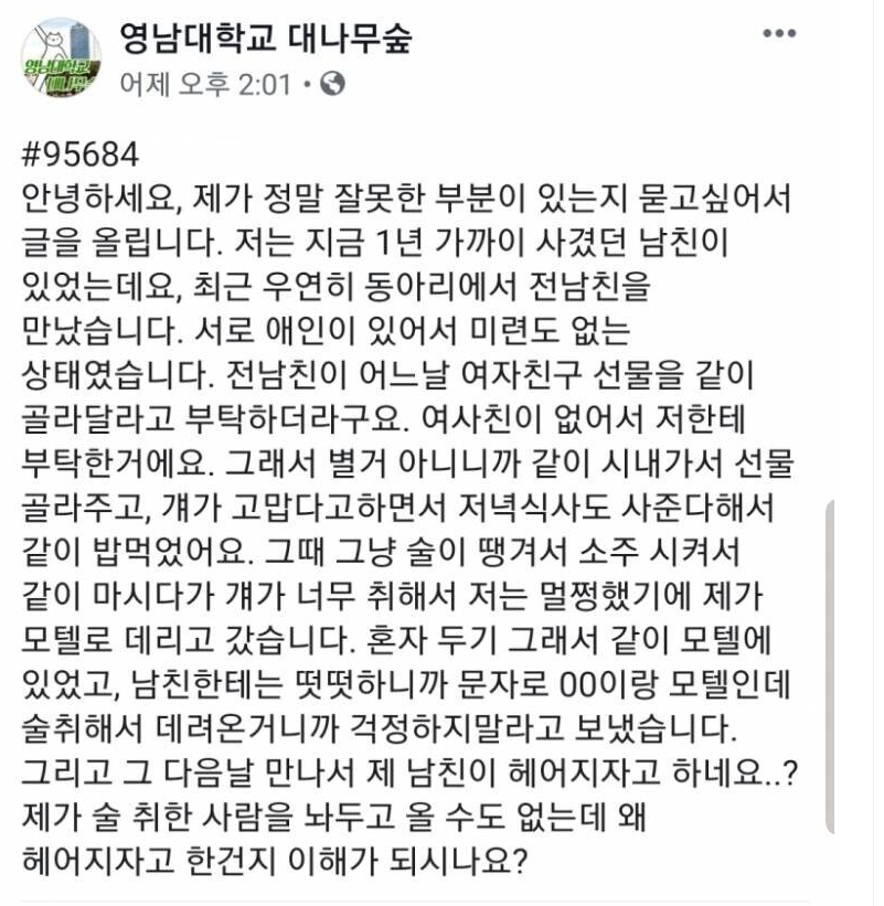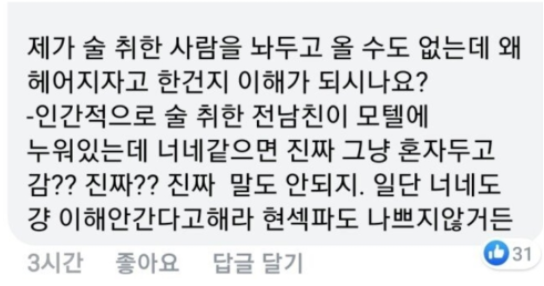 A씨는 “그 다음날 만나서 제 남친이 헤어지자고 하네요? 제가 술 취한 사람을 놔두고 올 수도 없는데 왜 헤어지자고 한건지 이해가 되시나요?”라며 글을 마쳤다.
