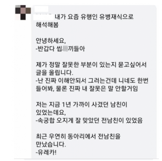 A씨의 글에 많은 이들의 반응은 당연히 싸늘했고 한 누리꾼은 A씨의 글을 유병재식 언어로 재해석해서 올려 화제가 됐다.