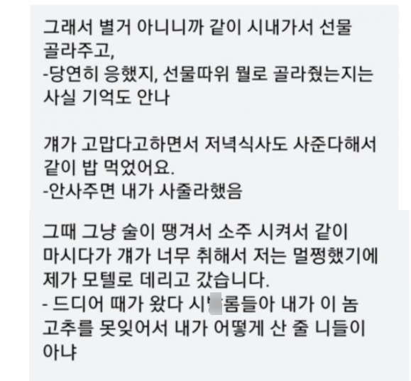A씨는 “걔가 고맙다고 하면서 저녁식사도 대접한다기에 같이 밥먹었어요. 그때 그냥 술이 땡겨서 소주 시켜서 같이 마시다가 걔가 너무 취했어요. 저는 멀쩡했기에 제가 모텔로 데리고 갔습니다. 혼자 두기 그래서 같이 모텔에 있었어요”라고 전했다.