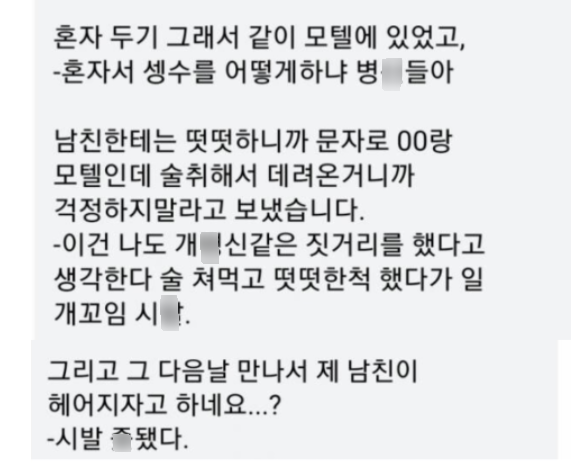 “OO(전남친)이랑 모텔인데 술취해서 데려온거니까 걱정하지마!”