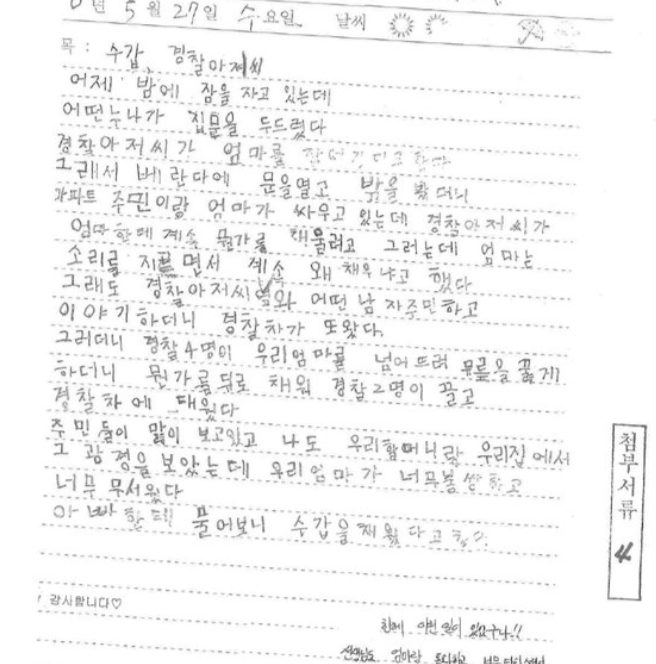 A씨는 “당시 엄마가 경찰관들에게 수갑이 채워져 끌려가는 장면을 직접 목격한 아들은 일기에 그날 있었던 일을 적을 정도로 충격을 받아 학교에서 심리상담 치료를 받고 있다”고 했다.