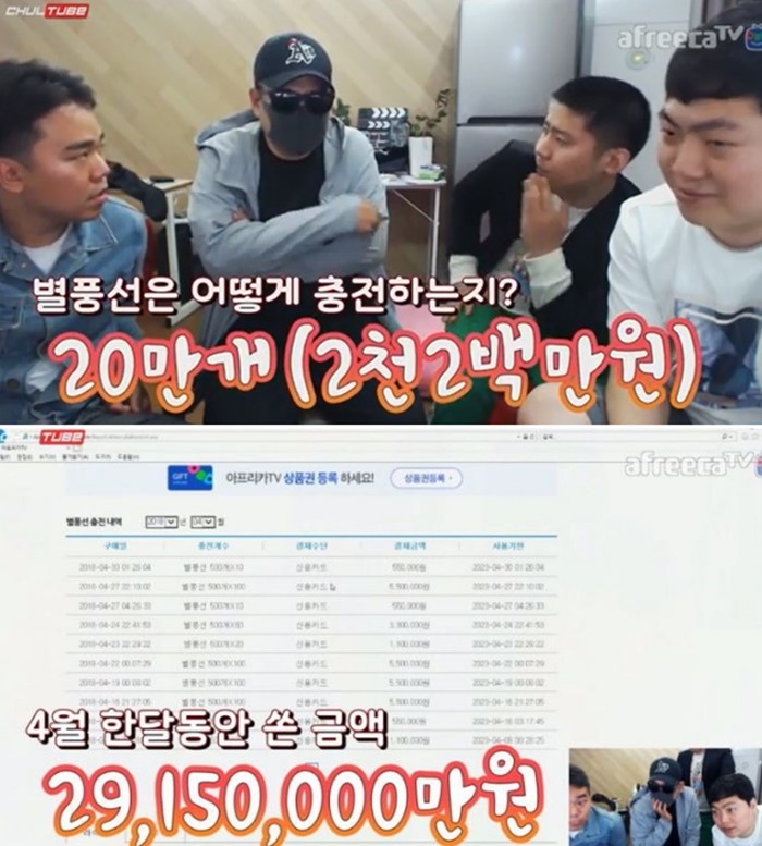 ‘큰손’으로 유명한 A씨가 한 달에 충전하는 별풍선은 약 2천만 원어치이며 4월에도 2,915만 원을 충전한 사실을 인증하기도 했다.