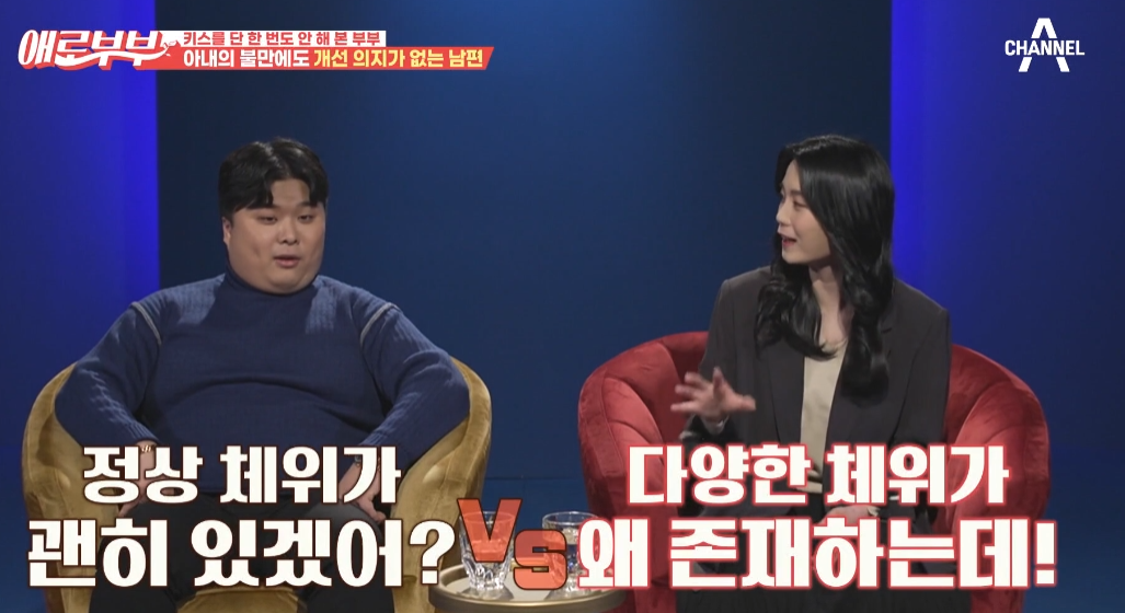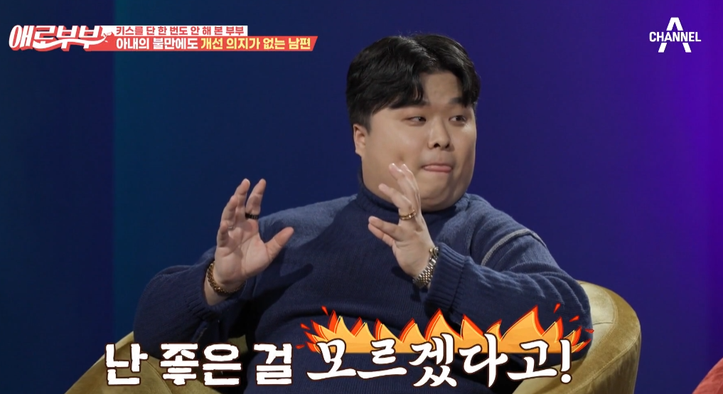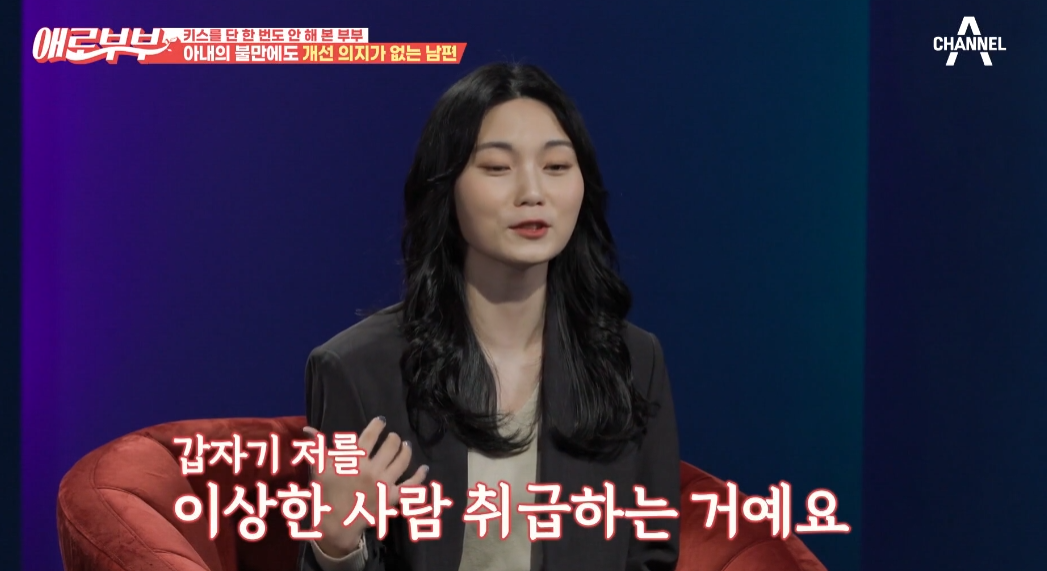 남편 정 씨는 “키스같은 게 꼭 필요하냐. 굳이 왜 해야 하냐”라 자신의 소신을 말하니 아내 이 씨는 어이없다는 듯 남편을 쳐다봤다.