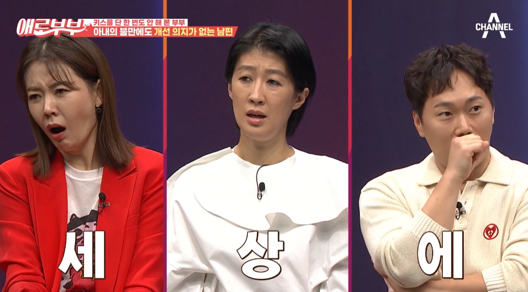 이 씨는 “키스를 시도하면 남편이 입을 꾹 다문다”라 상황을 설명하며 정 씨는 “다가와도 별 감정이 안 든다”라 웃었다.