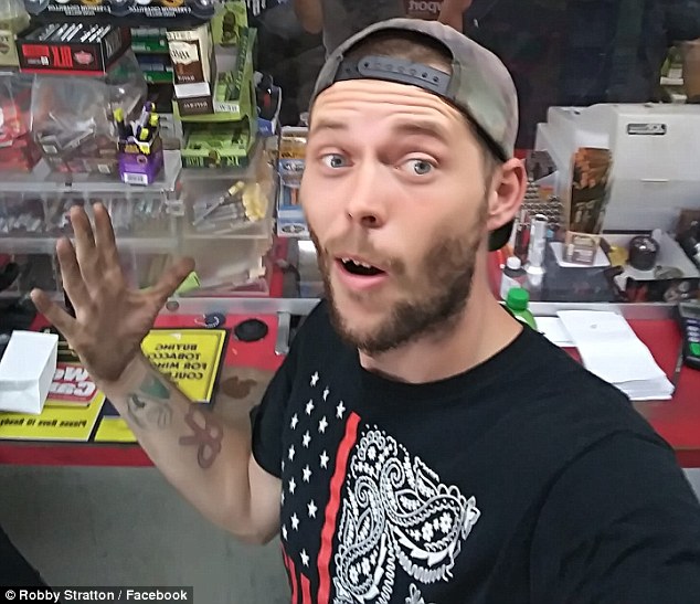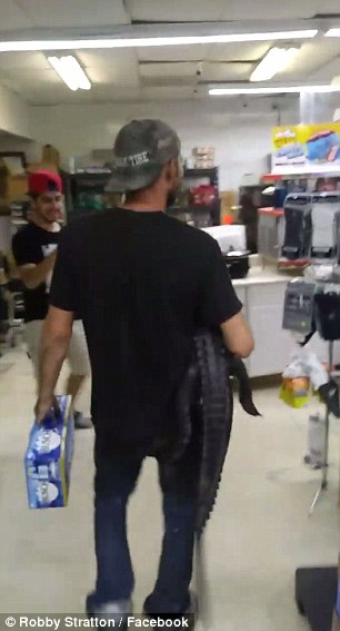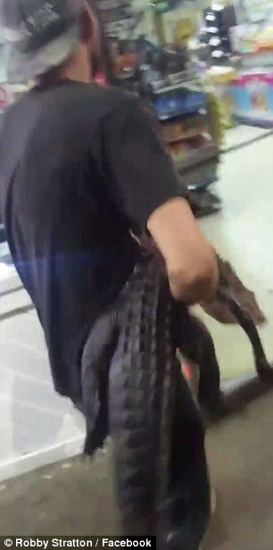 영상 속 남성은 로비 스트레톤(Robby Stratton)으로 밝혀졌으며 입을 테이프로 막은 악어를 한 손에 들고 상점에 들어왔다.