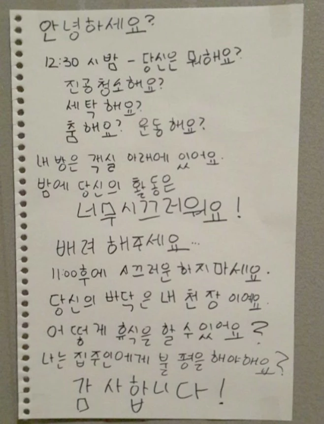 이어 “밤 12시 30분 당신은 뭐해요?”, “진공 청소해요?, 세탁해요?, 춤해요?, 운동해요?”라며 “내 방은 객실 아래에 있어요. 밤에 당신의 활동은 너무 시끄러워요!”라고 적었다.