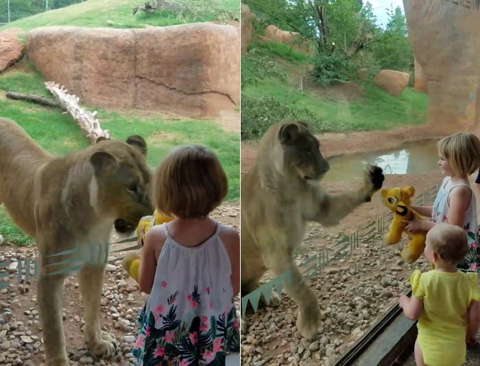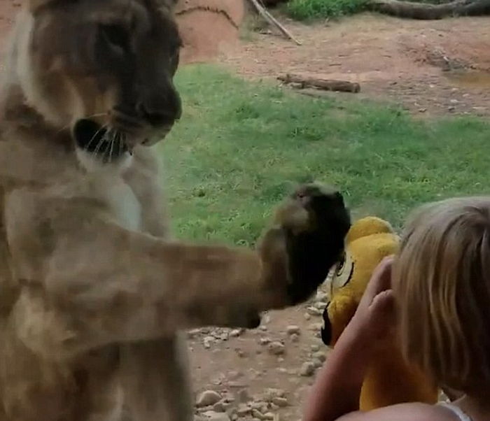 인형을 가까이 보여주자 암사자는 자신의 발을 들어 유리창을 쓰다듬었다.