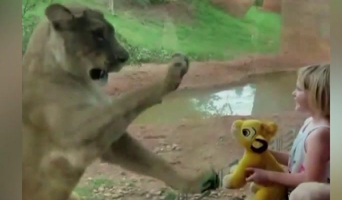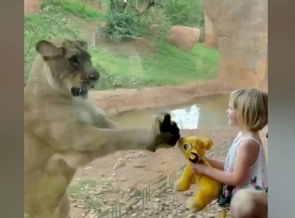 어린 소녀의 품에 있는 인형이 자신의 아기라고 생각한 엄마 사자의 모습이 누리꾼들에게 화제다.
