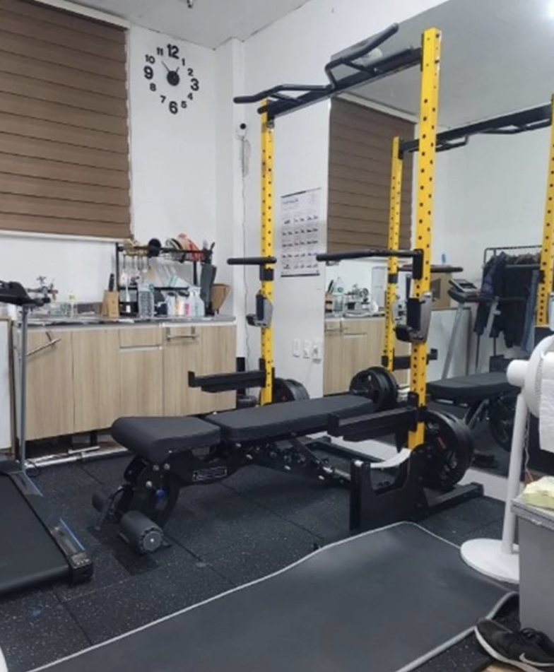 이 뿐만 아니라 헬스 기구인 덤벨과 벤치 프레스 등 냉장고, 전자레인지 등 주방용품을 배치한 것을 공개했다.