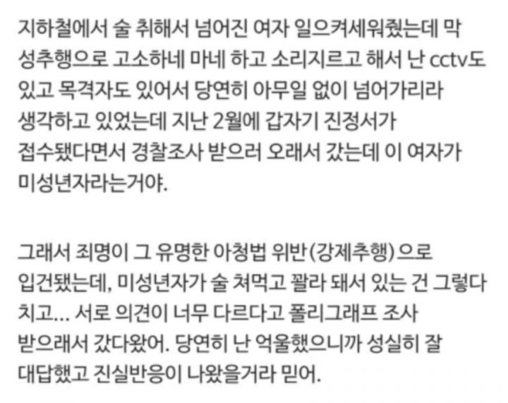 “술 취한 여고생 일으켜 세워줬다가 아청법으로 신고당했습니다”