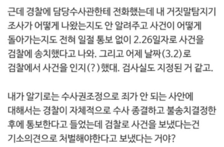 A씨는 “근데 경찰이 담당수사관한테 전화했는데 내 거짓말탐지기 조사 결과도 안 알려주고 사건이 어떻게 돌아가는지 일절 이야기 없이 2월 26일자로 사건을 검찰에 송치했다고 나온다.