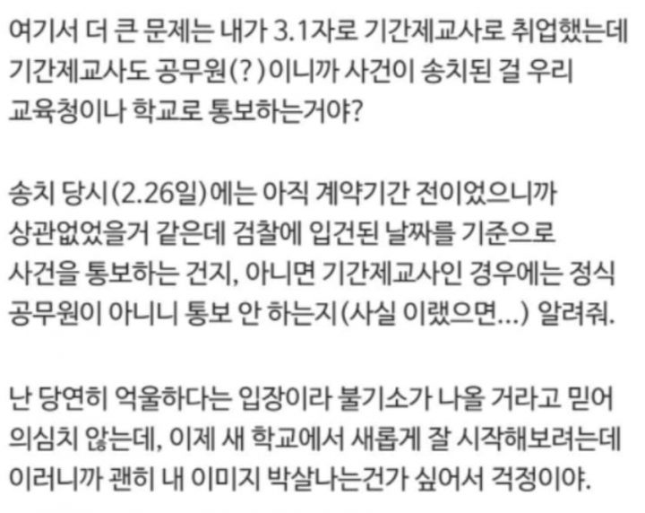 이어 “더 큰 문제는 내가 3월 1일자로 기간제교사로 취업했는데 기간제교사도 공무원(?)이니까 사건이 송치된 걸 우리 교육청이나 학교로 통보하는 건가?”라고 덧붙였다.