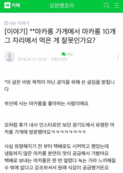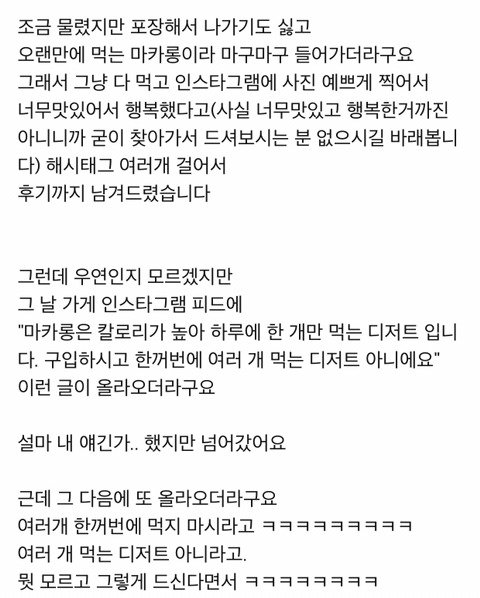 그날 이후, 조금 이상한 글을 발견했다. 카페 공식 SNS에 “마카롱은 칼로리가 높아 하루에 한 개만 먹는 디저트다. 구입하고 한꺼번에 여러 개 먹는 디저트가 아니다”라는 글이 올라온 것.