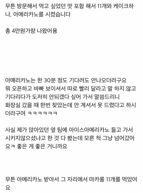 그리고 고대하던 마카롱과 커피가 나왔고 A씨는 그 자리에서 마카롱 11개를 전부 먹었다고 한다. “포장해서 나가기도 싫었고, 오랜만에 먹는 것이라 잘 들어갔다”고 말했다.