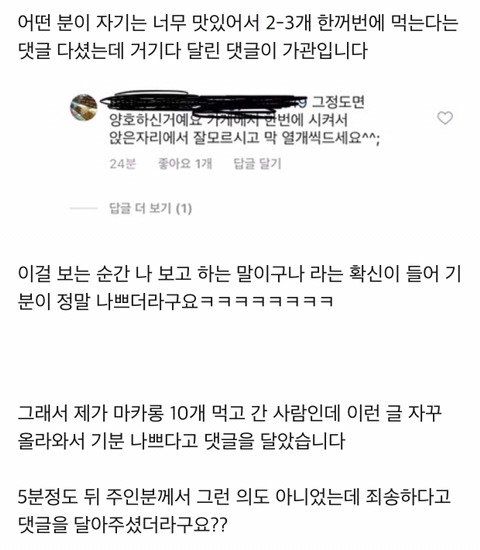 이에 다른 고객이 “나는 너무 맛있어서 2~3개를 한꺼번에 먹는다”고 댓글을 달았는데, 이에 카페 측은 “그정도면 양호한 거다.