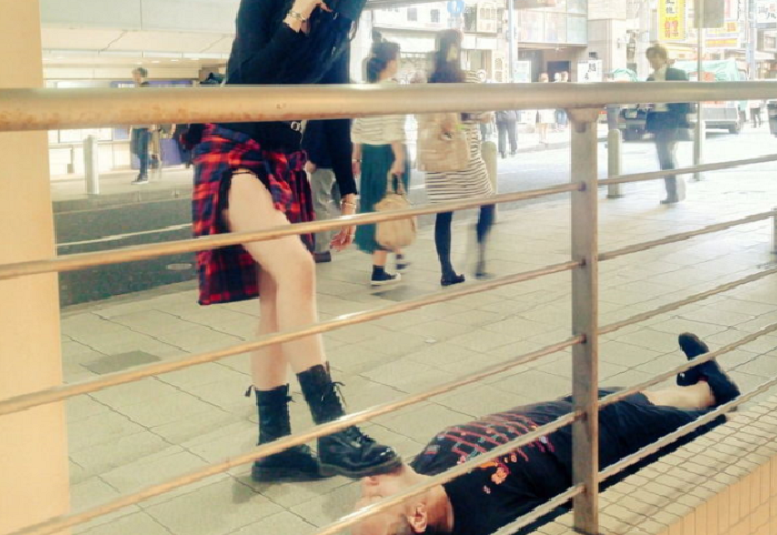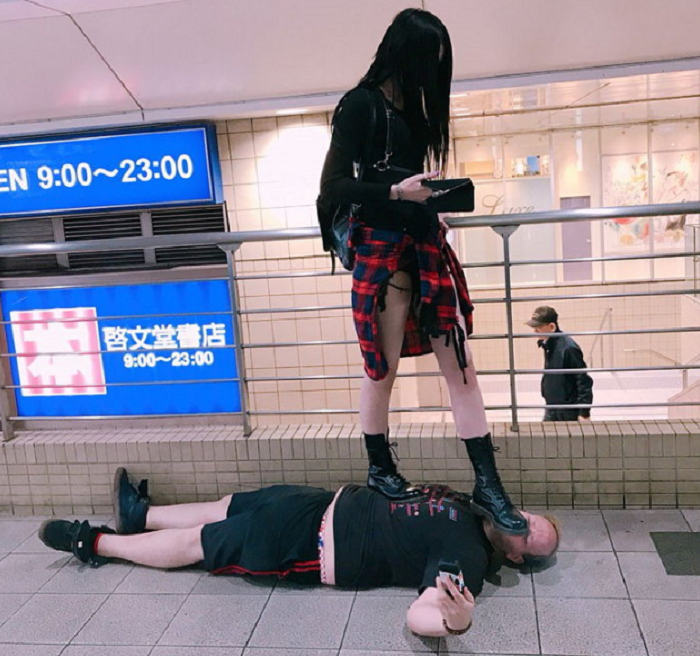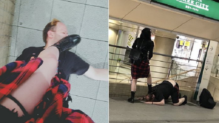 지난 26일(현지 시간) 트위터 계정 ‘myhero1118’에 일본 도쿄 한복판에서 여성에게 밟히고 있는 남자의 사진이 게재됐다.