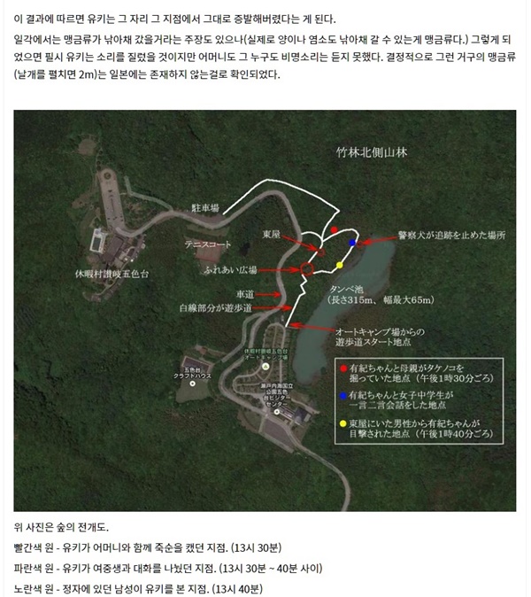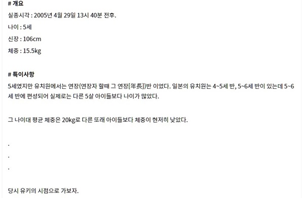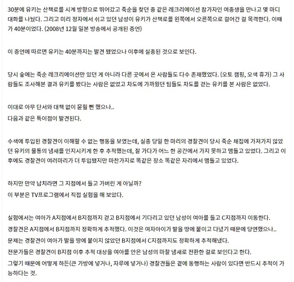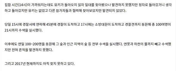 실종 신고 이후 신속하게 경찰이 수사를 시작했으나 산책로에서 유키를 목격했다는 사람만 존재했다.