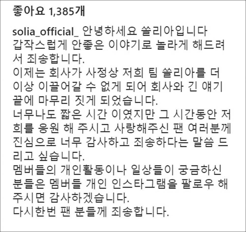 쏠리아는 “갑작스럽게 안 좋은 이야기로 놀라게 해드려서 죄송하다. 이제는 회사가 사정상 저희 팀을 이끌어 갈 수 없게 되어 회사와 긴 이야기 끝에 마무리 짓게 됐다”라며 해체를 발표했다.