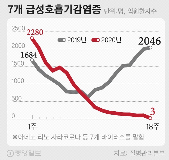 그래프에 따르면 7개 급성호호흡기 감염증 환자가 2019년 1월부터 4월까지 2046명이었다면, 2020년 같은 기간에 3명으로 나타났다.
