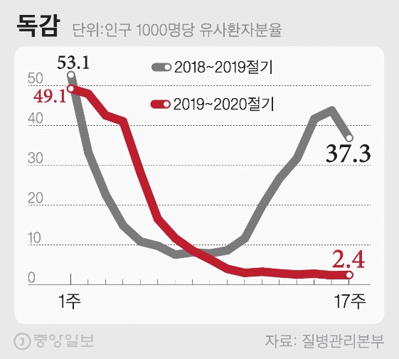 또 독감 역시 인구 1000명 당 걸린 확률이 2018-2019년 37.3이라면, 2019-2020년에는 2.4로 나타났다.