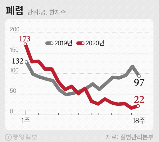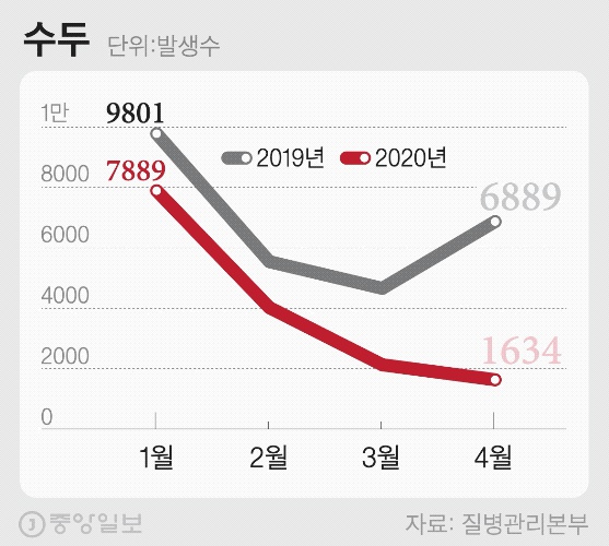 폐렴 환자 수 역시 작년에는 97명이었다면 올해는 22명으로 줄었으며, 수두 환자 역시 6889명에서 1634명으로 줄어든 모양새를 띄었다.