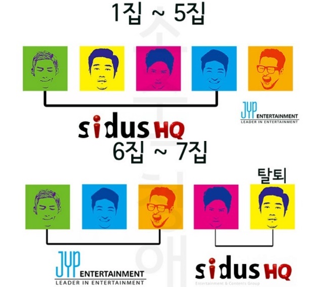 이후 6집부터 7집까지는 탈퇴한 윤계상, sidus HQ 소속을 유지한 데니안 외 3명이 JYP 엔터테인먼트다.