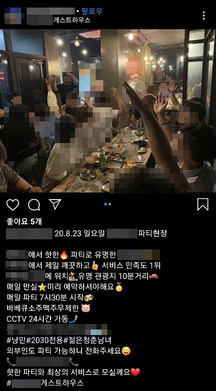 방역을 준수한다며 홍보에 나선 게스트하우스도 “22일 토요일 파티! 강화된 코로나 방역을 지침을 준수하여 진행했다”며 홍보글과 함께 관련 사진을 공개했지만 실제 거리두기 등 방역이 제대로 이뤄지지 않은 것으로 전해졌다.