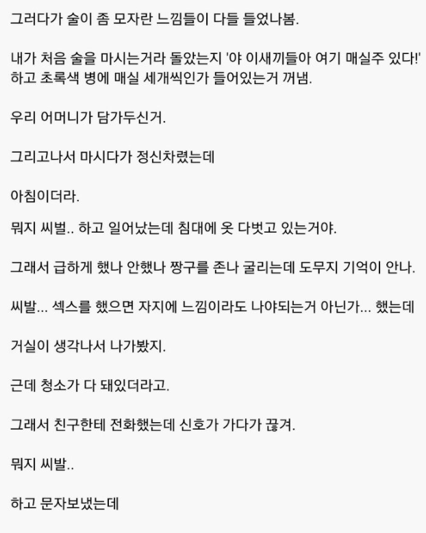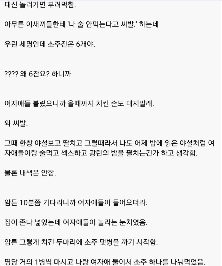 10분뒤 여자애들이 왔고, 명당 1병씩 술을 마시고 집에 있던 매실주 까지 먹었다고 한다.