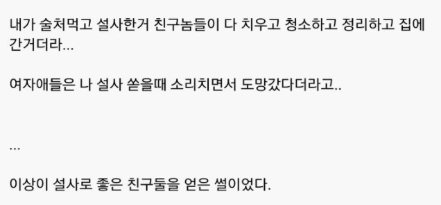 친구에게 문자를 보내니, 글쓴이는 술을 먹고 설사를 했고, 친구들이 다 치우고 청소하고 정리하고 집에 갔다고 했다고 한다.