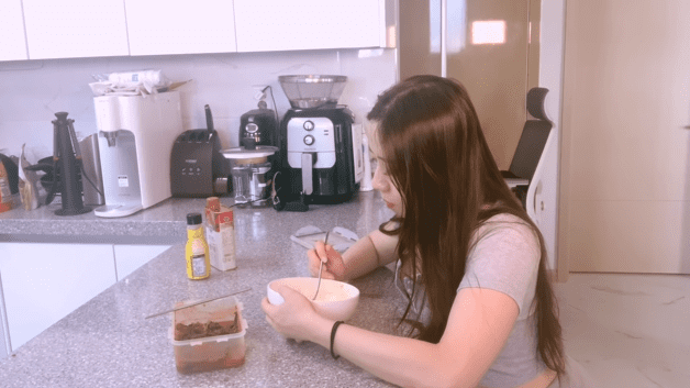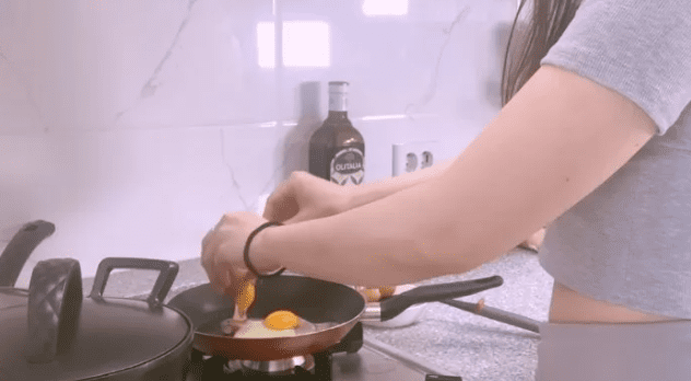 그는 운동 브이로거라서 그런지 몸에 달라붙는 운동복을 입고 주방에 나타나 요리했다.