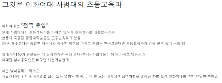 글쓴이 A씨는 “국내에서 유일하게 이화여대는 초등교육과를 가지고 있어 초등교사를 배출할 수 있다”고 했다.