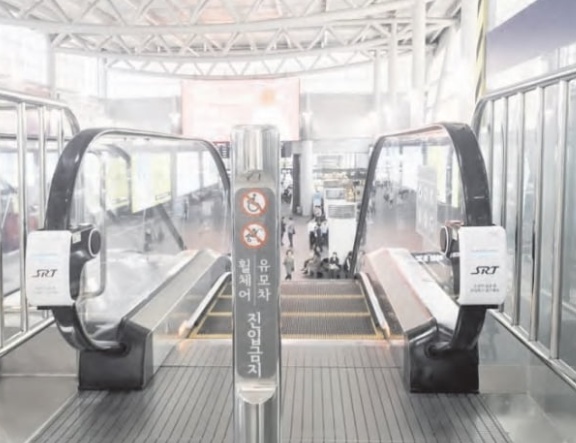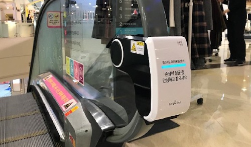 해당 게시물에는 에스컬레이터 손잡이 레일에 부착된 살균장치가 보였다.