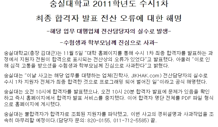 당시 총장의 사과 글과 해명 글에는 수시 관련 업무는 숭실대에서 직접 한 것이 아니라 위탁을 받고 관리하던 진학사 담당자의 실수였다.