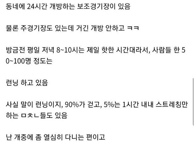 A씨는 “동네에 24시간 개방하는 보조경기장이 있음. 물론 주경기장도 있는데 거긴 개방안하고 방금전 평일 저녁 8~10시는 제일 핫한 시간대라 사람들 한 50~100명 정도는 런닝 하고 있음”이라면서 글을 쓰기 시작했다.