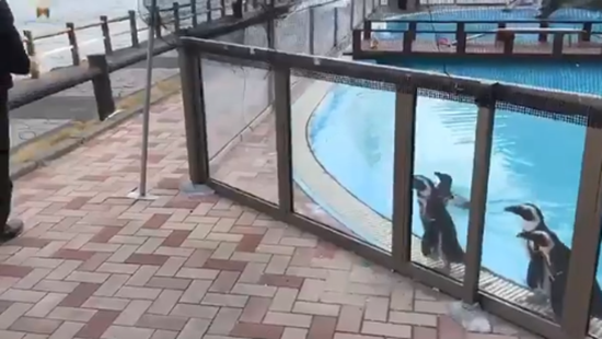 도쿄 아와시마 해양 공원에서 한 무리의 펭귄들은 유리 밖에 있는 남성을 응시하고 있다.