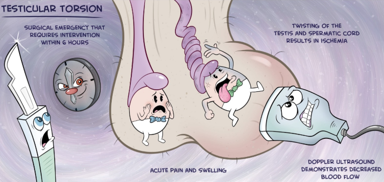 대부분 잠을 자다가 자연발기로 고환이 돌아가는 경우지만, 성적 자극과 격렬한 운동을 하다가 고환에 부상을 당해 생기는 경우도 있다고 한다.