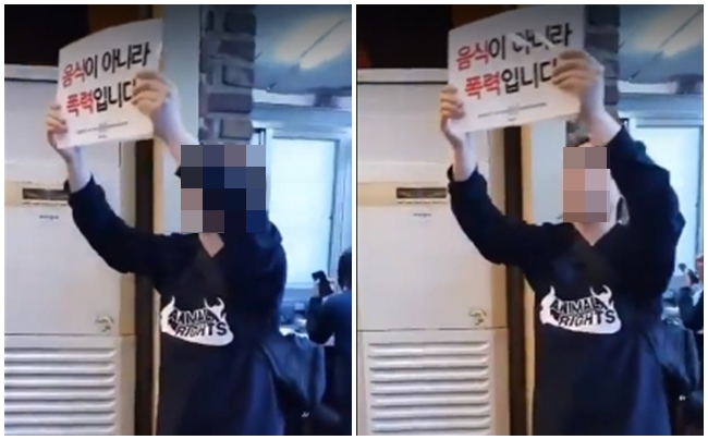 공개된 영상을 보면 A씨는 ‘음식이 아닌 폭력’이라는 팻말을 든 채 고기뷔페집을 돌아다녔고 식사를 하고 있는 손님에게도 “여러분들이 먹는 건 음식이 아닌 동물입니다! 음식이 아니라 폭력이다”라고 전했다.