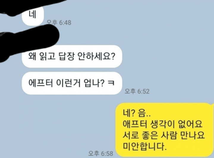 그러자 무례하게 소개팅녀는 “애프터 이런 거 없나?’라며 반말 카톡을 보냈다.