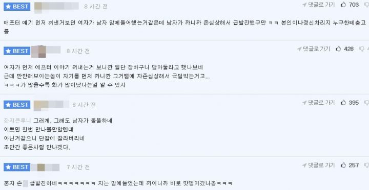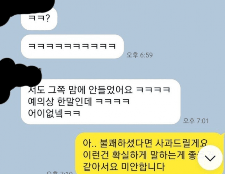 이에 A씨는 “애프터 생각이 없어요. 서로 좋은 사람 만나요. 미안합니다”라고 정중히 거절의사를 보이자 소개팅녀는 “저도 그쪽 맘에 안들었어요”라며 “예의상 한 말인데 어이없네”라고 반응했다.