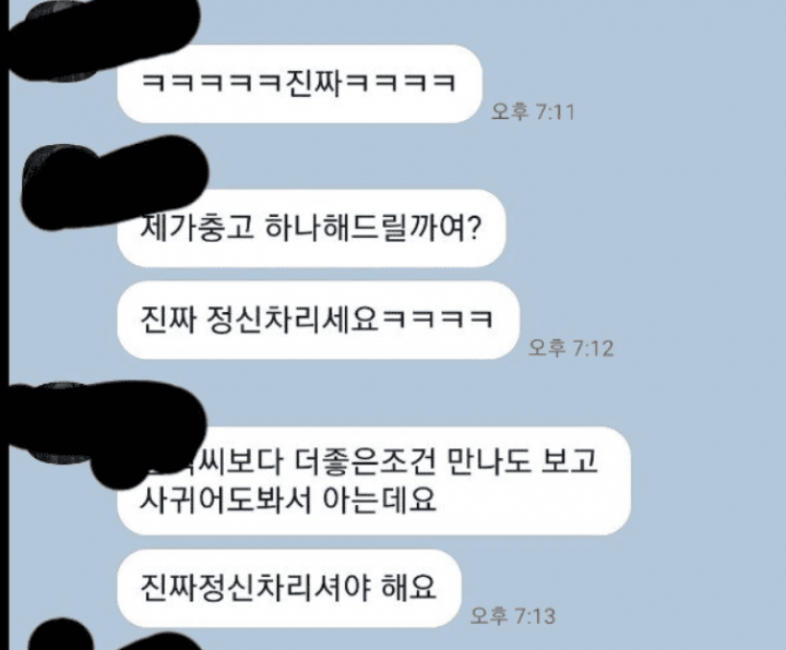 이어 소개팅녀는 “충고 하나 해드릴까요? 진짜 정신 차리세요”라며 “A씨보다 더 좋은 조건 만나도 보고 사귀어서 아는데 진짜 정신차리셔야 해요”라고 카톡을 보냈다.